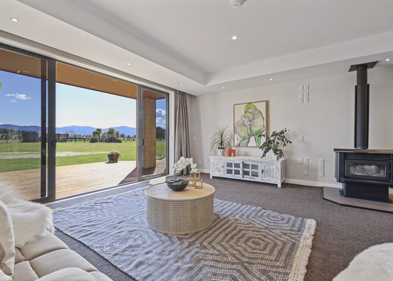 Large fireplace with wetback for cosy winters. Nearly all rooms lead to outside decking